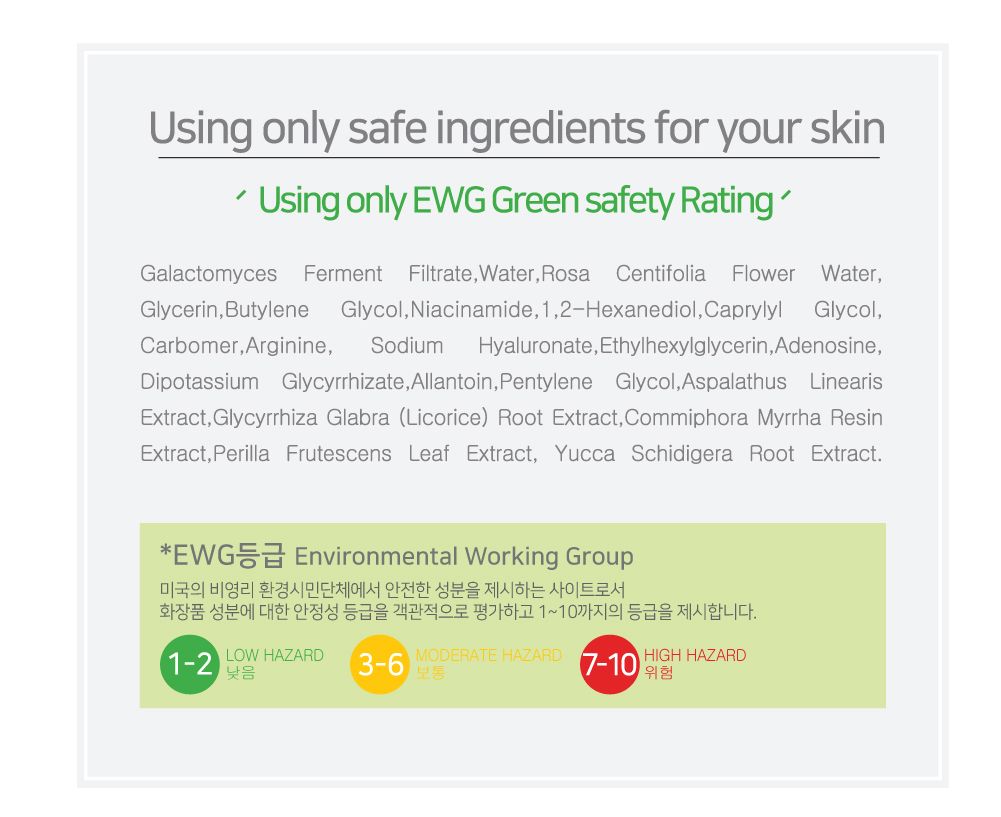 Water/Aqua, Galactomyces Ferment Filtrate, Rosa Centifolia Flower Water, Butylene Glycol, Glycerin, Propylene Glycol, Niacinamide, Sodium Hyaluronate, Adenosin, IllicumVerum(Anise) Fruit Extract, ScutellariaBaicalensis Root Extract, ZanthoxhlumPiperitum Fruit Extract, Pulsatilla Koreana Extract, UsneaBarbata (Lichen) Extract, Aloe Barbadensis Leaf Extract, Dipotassium Glycyrrhizate, Disodium EDTA, Allantoin, Carbormer, Sodium Hydroxide, 1,2-Hexaanediol