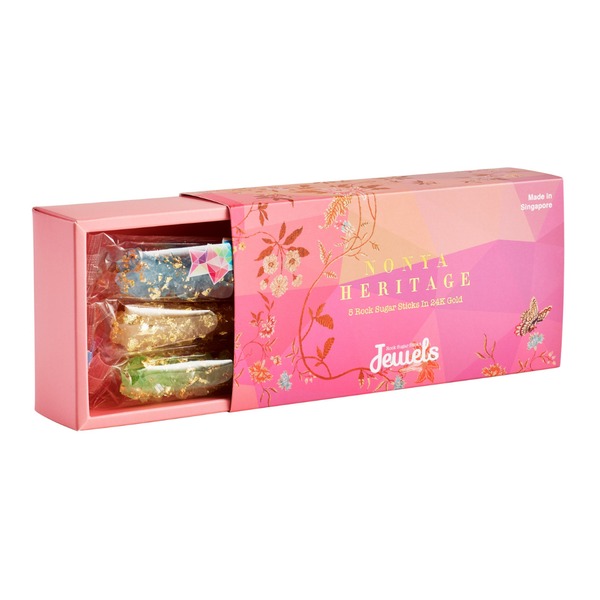 The Nonya Heritage is a collection of rock sugar sticks that takes a spin on the peranakan culture. These Jewels Rock Sugar Sticks are handcrafted, naturally crystallized, flavoured, and clad in 24 carats of edible gold. Eat it as a candy, or "dipping candy" in any beverage to sweeten your day. Flavours: - Logan Cheng Tng with gold leaves and dust - Coconut with gold leaves - Pandan Chiffon with gold leaves - Butterfly Blue Pea Yam with gold leaves - Rose Bandung with gold leaves