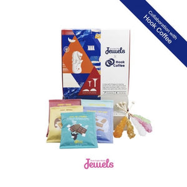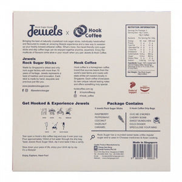 A special collaboration between Jewels Rock Sugar Sticks and Hook Coffee for coffee enthusiasts alike. 5 Jewels Rock Sugar Sticks (14g x5, Total 70g) & 5 Hook Coffee Drip Bags (10g x5, Total 50g) Enjoy the multitude of flavours come alive in your mouth when you pair Jewels and Hook Coffee.