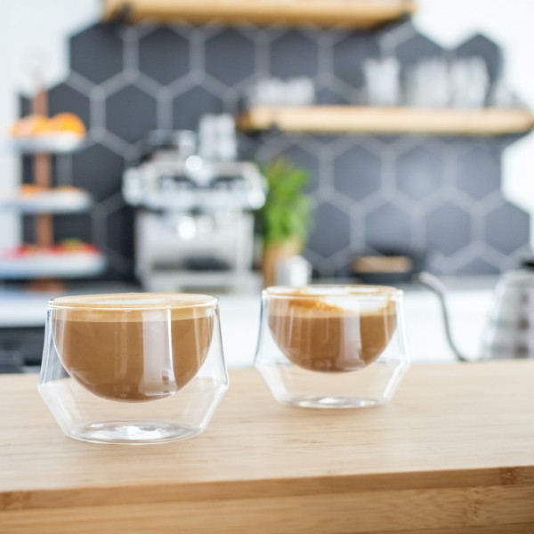 FEATURES - Spherical Design - Optimized for latte art - Works for black coffee - Works as insulated cupping bowl - Hand-blown borosilicate glass - Insulated glass- keeps coffee warm, while cool to the touch - Dishwasher Safe - Set of two - Not microwave safe (due to gold leaf logo)