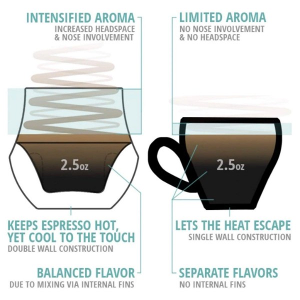 Due to espresso’s oily nature, it can easily stratify and separate into different tasting layers. However, thanks to three internal fins and a convex-shaped bottom, when swirled in the hand, the PROPEL glass will agitate the coffee and de-stratify the various layers, providing a consistent and balanced flavor in every sip.