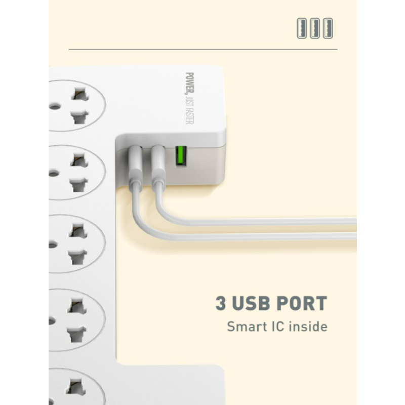 5 Socket Ports + 3 USB Ports