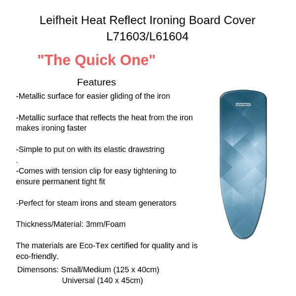 If you order the Heat Reflect S/M/Universal ironing table cover from Leifheit, you can pull it over your ironing table in no time with the help of the elastic cord pull. It consists of a 3 mm thick foam padding, which guarantees more ironing comfort. The iron glides easily on the metallized surface, which reflects heat. With the Heat Reflect S/M/Universal ironing board cover, the laundry can be ironed quickly and easily.