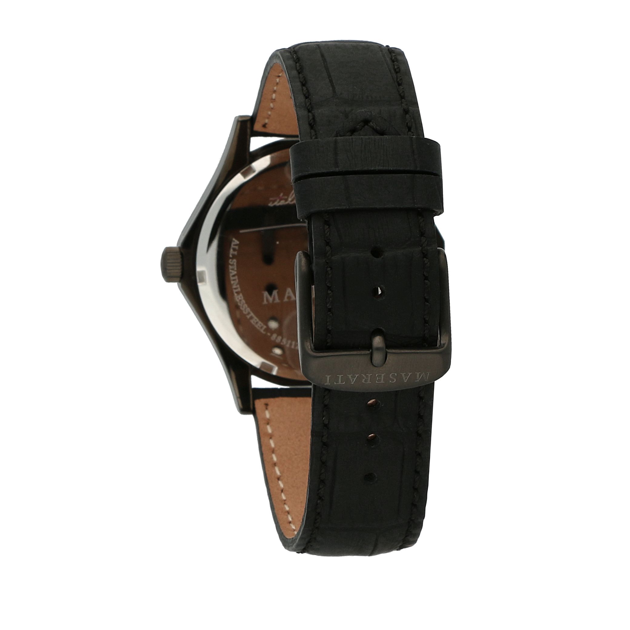 The new Maserati Circuito collection plays with clean and well-defined geometry. This watch is characterized by a 42 mm gunmetal coloured case and blue screws on the bezel. The open date perfectly accompanies the blue dial with silver coloured details, while the strap is made of black crocodile print leather. Screw-down crown and back, 3H Movement, Water Resistant 10 ATM.