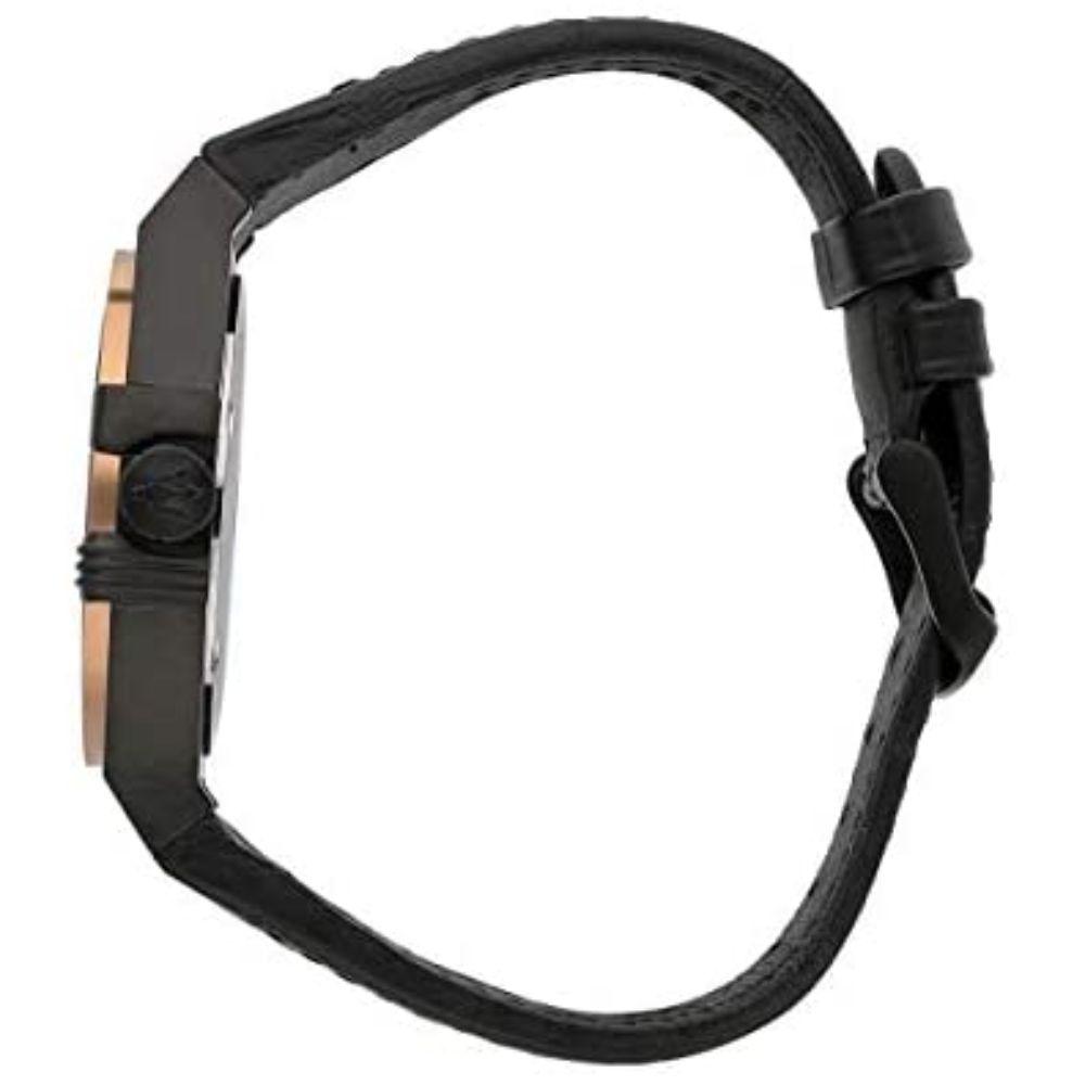 Black PVD stainless steel case with a black leather strap. Fixed rose gold PVD bezel. Black dial with rose gold-tone hands and index hour markers. Minute markers around the outer rim. Dial Type: Analog. Luminescent hands. Date display above the 6 o'clock position. Hattori calibre VJ42 quartz movement. Scratch resistant mineral crystal. Screw down crown. Solid case back. Round case shape. Case size: 42 mm. Case thickness: 10.70 mm. Band width: 24 mm. Tang clasp. Water resistant at 100 meters / 330 feet. Functions: date, hour, minute, second. Casual watch style. Watch label: Japan Movt. Maserati Potenza Quartz Black Dial Men's Watch R8851108032.