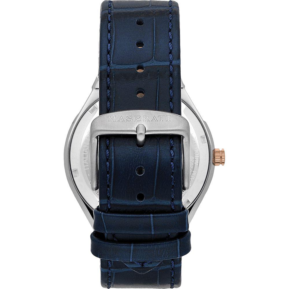 Maserati men's watch from the Stile collection. Automatic Watch With Silver Dial. The Case Is In Brushed And Refined Steel Of 42mm. The strap is blue. Leather watch with pin buckle closure. The Resistance to Water is 10 Atm. The reference is R8821142001.