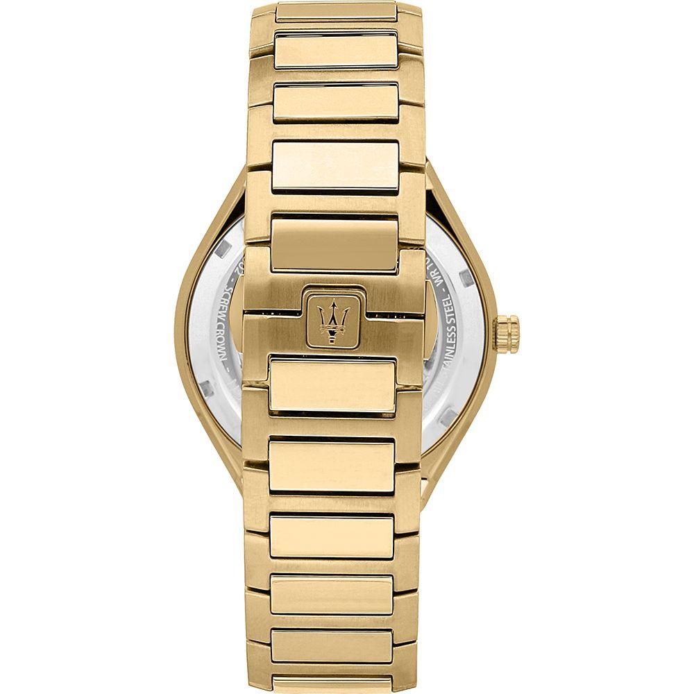 The new Maserati Stile collection plays with clean and well-defined geometry. This watch is characterized by a 42 mm steel case and bezel with exposed Gold screws. The open date perfectly accompanies the Gold colored dial, while the strap reflects the steel of the other elements. Screw-down crown and back, Water Resistant 10 ATM.