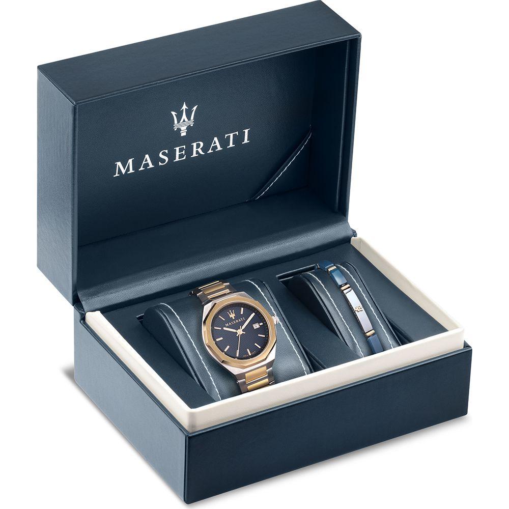 The new Maserati Stile collection plays with clean and well-defined geometry. This watch is characterized by a 45mm steel case and bezel with exposed Silver screws. The open date perfectly accompanies the silver colored dial with blue details, while the strap reflects the steel of the other elements. Screw-down crown and back, Water Resistant 10 ATM.