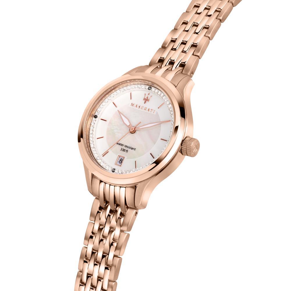 The new Maserati Circuito collection plays with clean and well-defined geometry. This watch is characterized by a 42 mm steel case and bezel with exposed blue screws. The open date perfectly accompanies the silver coloured dial with blue details, while the strap reflects the steel of the other elements. Screw-down crown and back, Water Resistant 10 ATM.