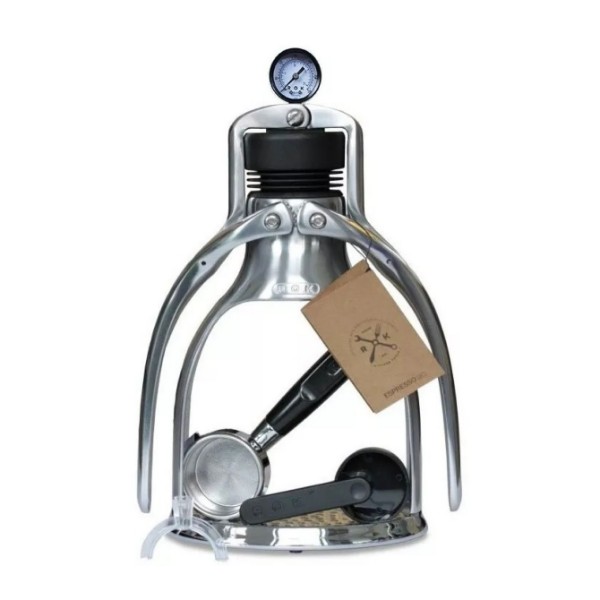 Crafted from cast Aluminium, Steel and Glass-composite. Complete with: - Pressure Gauge - Portafilter - Coffee spoon/tamper - Clip-on double adapter - Instructions - It even comes with a 1 year warranty on metal parts. All in a plastic-free gift box