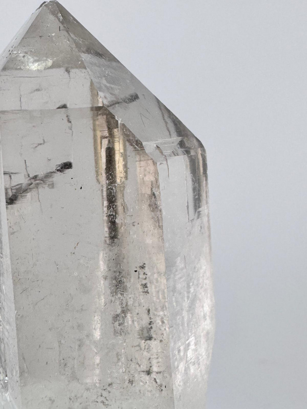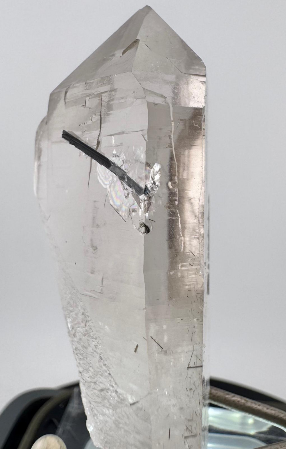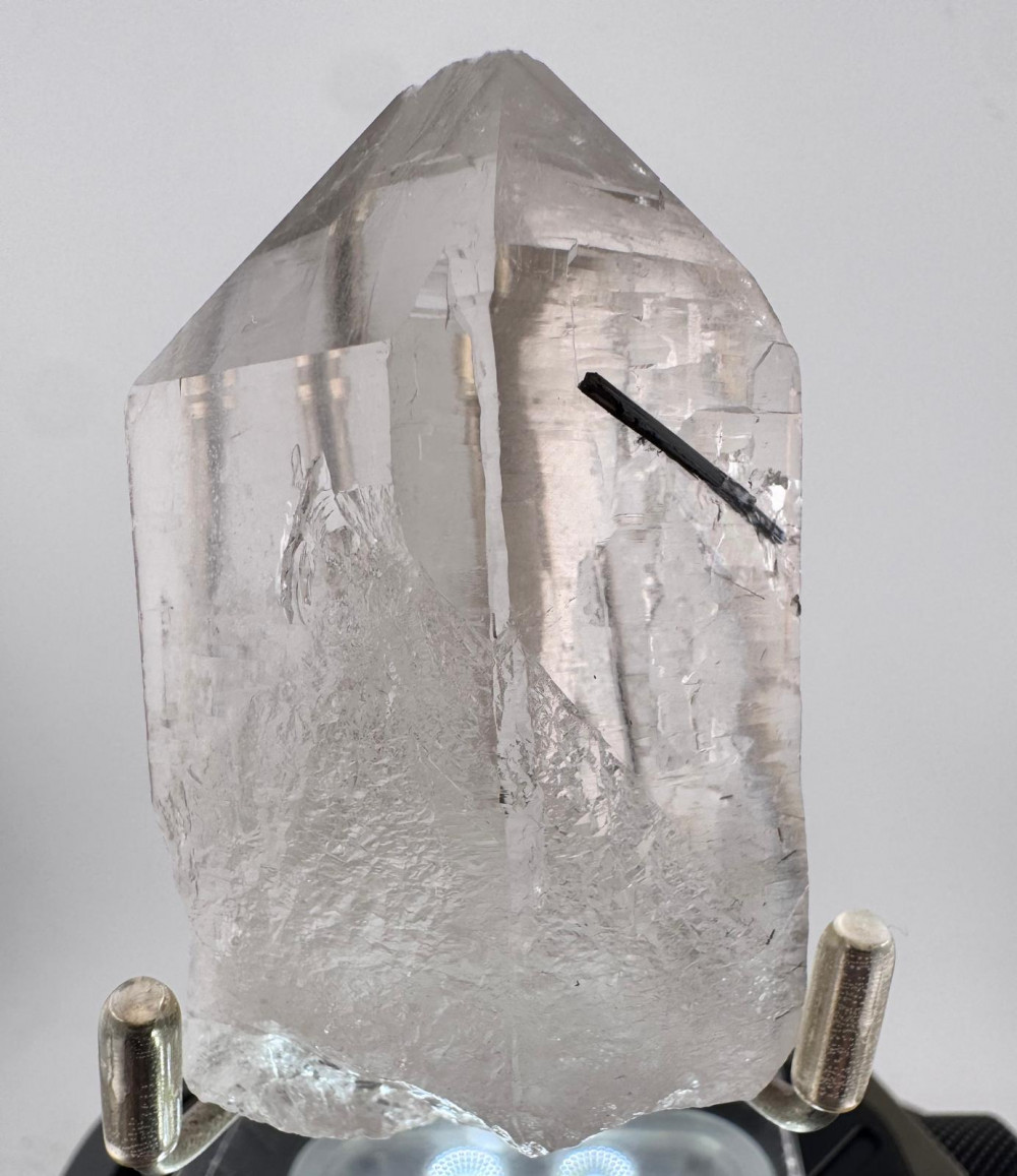 This exceptional specimen from Skardu, Gilgit-Baltistan, Pakistan features a pristine quartz crystal, distinguished by its sharp termination and remarkable clarity. Within its transparent body, fine inclusions and minor striations add depth and character, showcasing the crystal’s natural history and purity. A slender, dark needle—possibly rutile or schorl—pierces the core, offering striking contrast against the luminous quartz. At the crystal’s base, subtle dolomite is present, contributing a gentle, milky texture and enhancing the piece’s mineralogical diversity. The elegant interplay of clear quartz and soft dolomite, paired with the singular inclusion, creates a visually captivating and harmonious specimen. Sourced from one of Pakistan’s most celebrated mineral localities, this piece exemplifies the aesthetic refinement and geological richness for which Skardu is renowned.