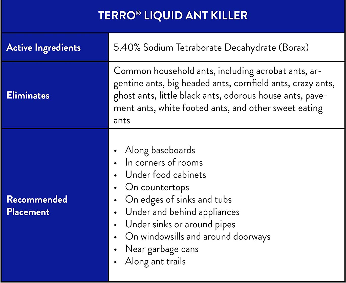 When you have a bug problem, you want to ensure your efforts are as simple and effective as possible. TERRO® Liquid Ant Killer uses borax to kill the ants you see, as well as the ants you don’t see. It works by allowing the forager ants to consume the product and survive long enough to carry the liquid back to the nest and deliver a dose to the rest of the colony. Complete control may take up to two weeks. For your convenience, the packaging conveniently comes apart to allow for easy placement.