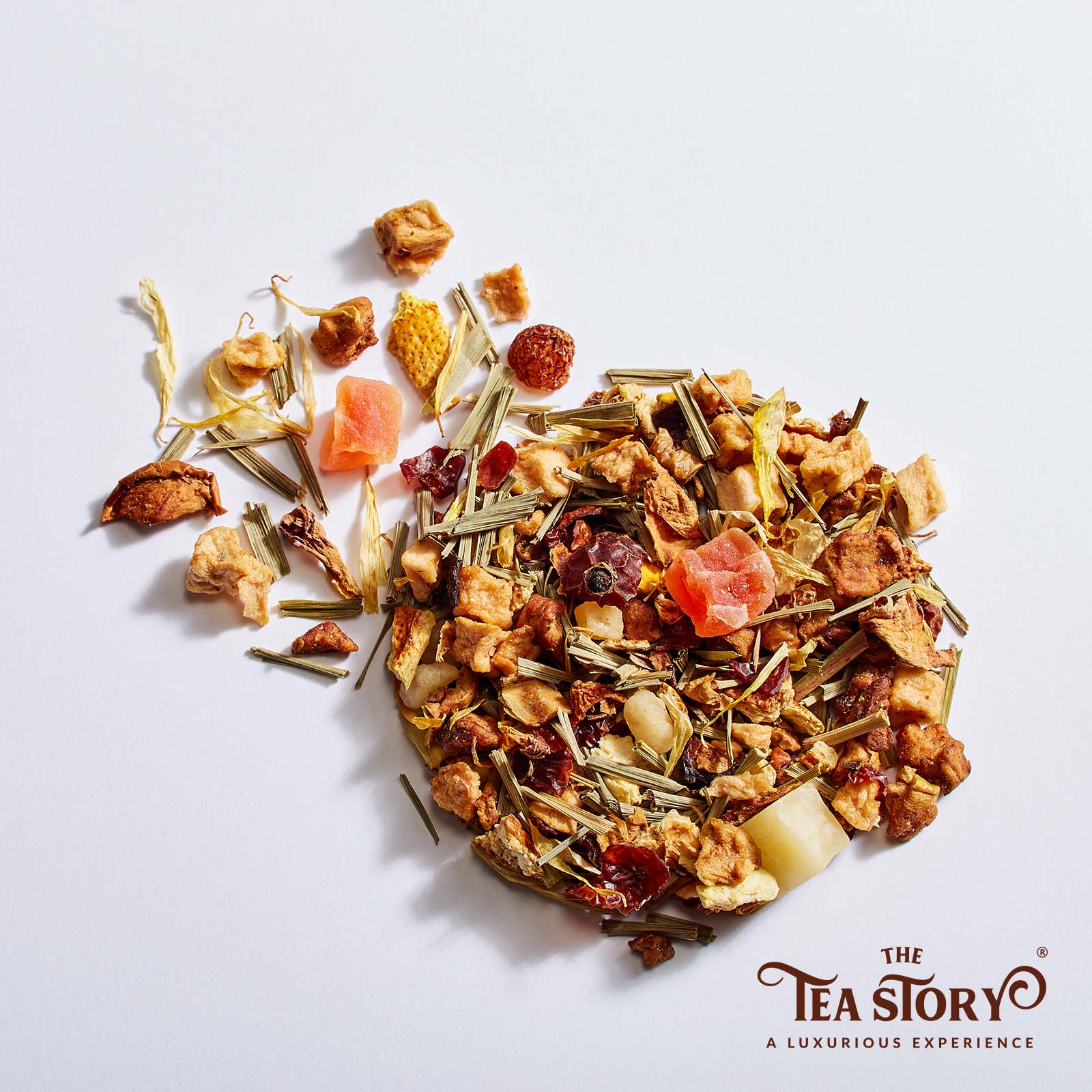 Ingredients: Apple Pieces (Roasted), Apple Pieces White, Melon Pieces, Rosehip Peel, Papaya Pieces, Orange Peel, Lemongrass, Turmeric, Rose Flower Petals, Marigold Bloom Petals