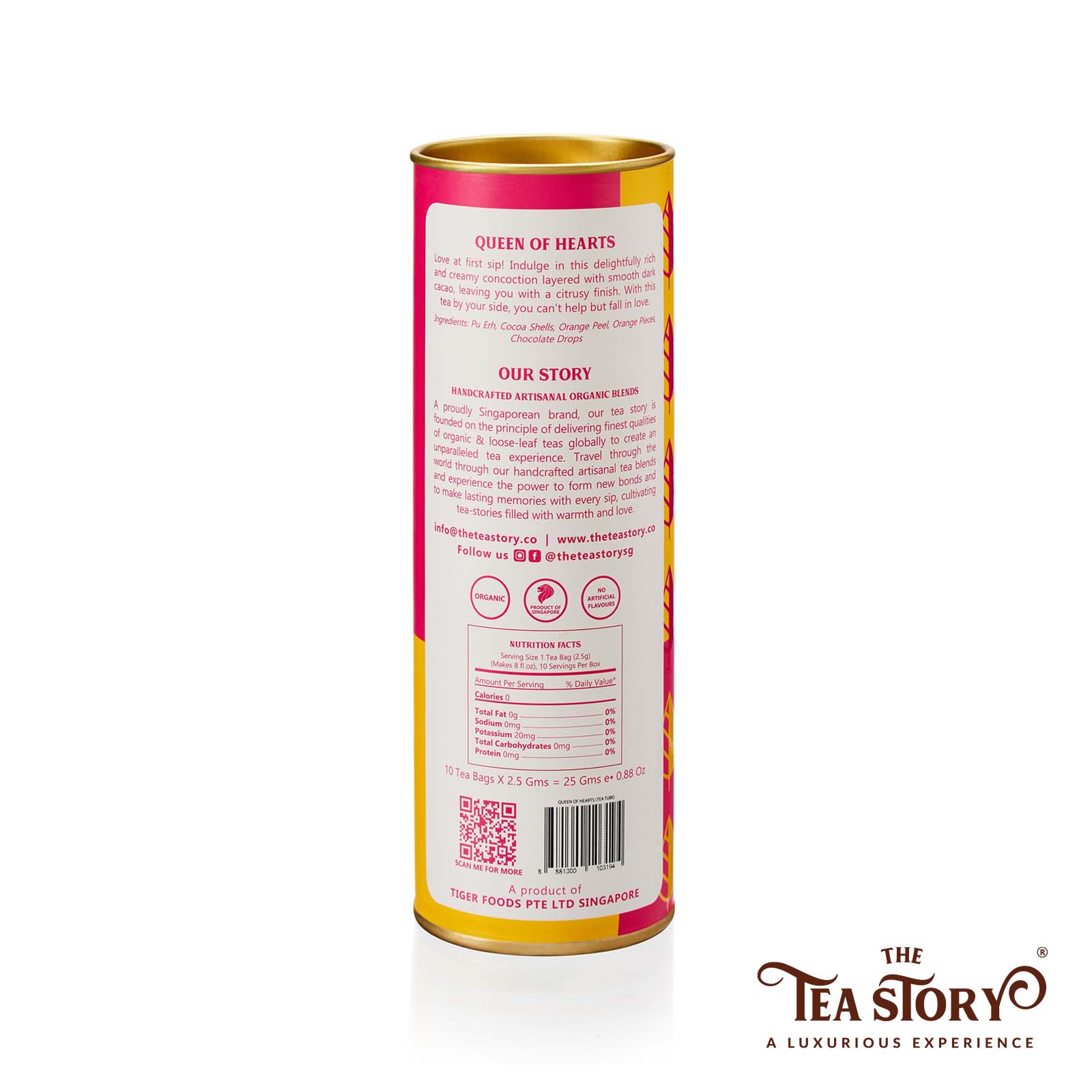 The Tea Story's Queen of Hearts Tea Tube includes: - 10 Luxury Pyramid Tea Bags of Queen of Hearts Blend