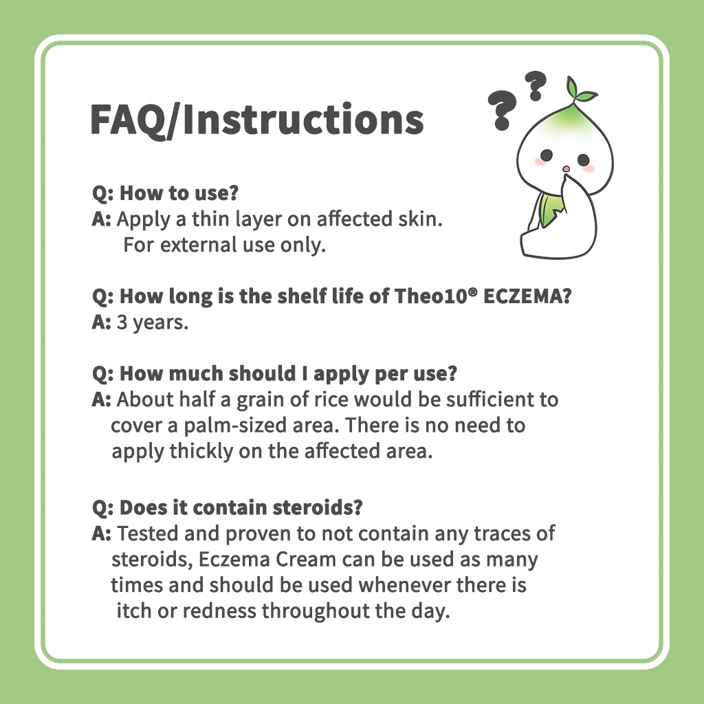 - Only apply Theo10®️ Eczema cream for 2-3 days or until skin is no longer itching or reddish and have started to heal.