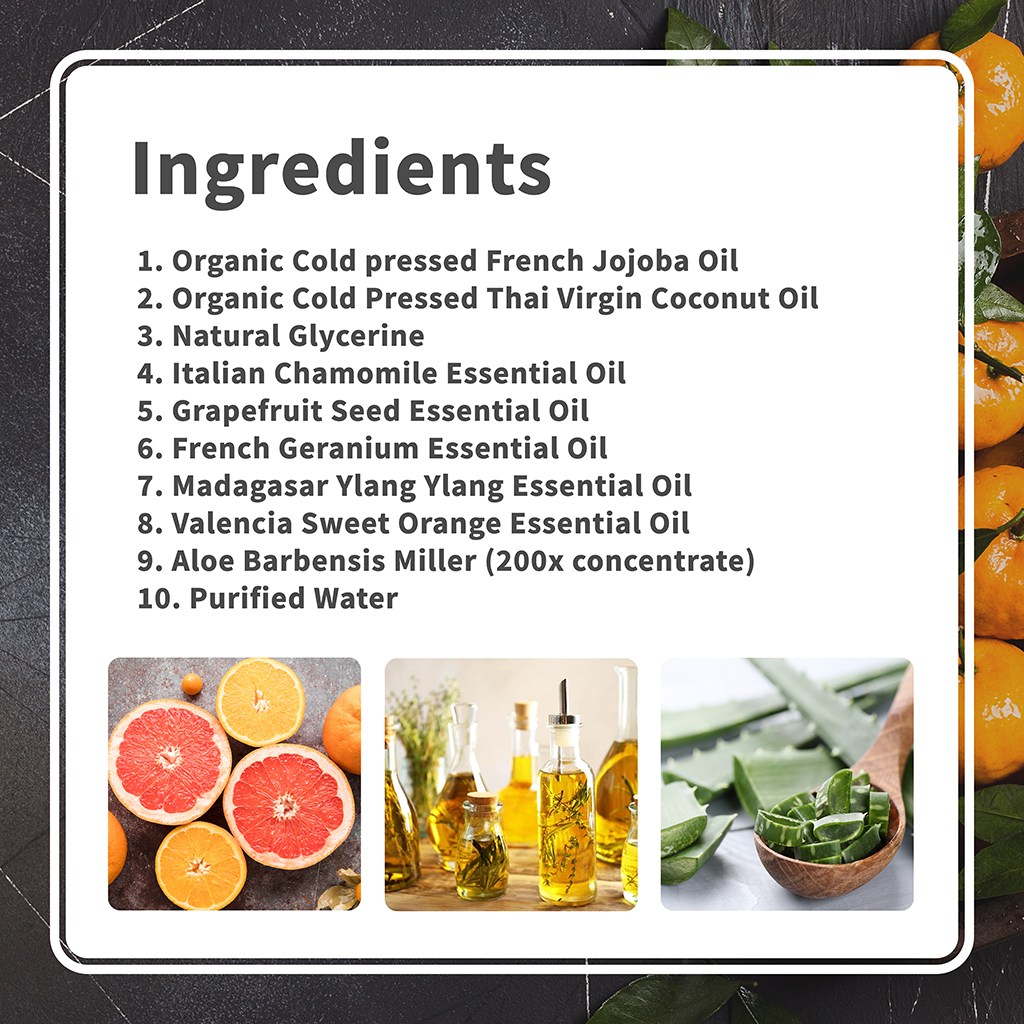 Theo10® Moisturize uses a unique combination of organic certified essential oils, cold pressed oils and naturally extracted glycerine. It hydrolyses the skin by reducing moisture loss while drawing and absorbing moisture from the air. Interestingly, the aloe vera we utilize is processed using a patented freeze-dried method- 200 aloe vera fillet is put through a shredder and a milling machine in which they are atomized and dosed with enzymes in a reaction tank. These enzymes break down the cellulose chain to reduce the viscosity and hence finally, spray-dried into a fine, free flowing powder to form 1 gram.