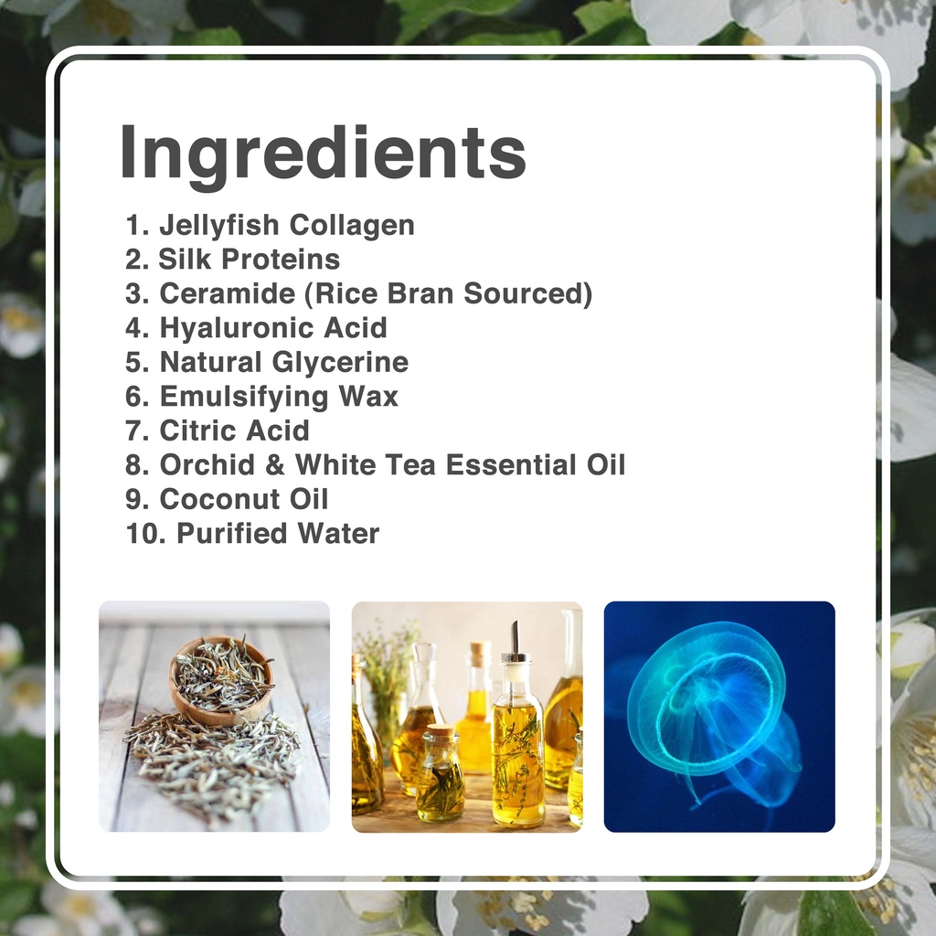 - World class cosmetic ingredients such as hyaluronic acid, premium jellyfish collagen, silk proteins