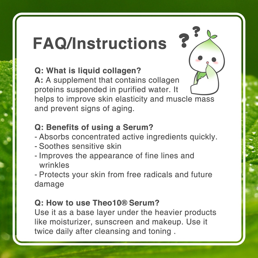 Theo10® Serum is a hydrating and antioxidant serum that helps protect your skin fro free radicals and prevention of fine lines and other visible signs of aging; and can heal and repair skin. It also helps to infuse your skin with extra moisture to supplement Theo10® Moisturize. Your skin would appear more radiant and fuller of color because it is less dry, fine lines and wrinkles look characterful and smoother.