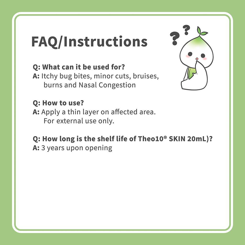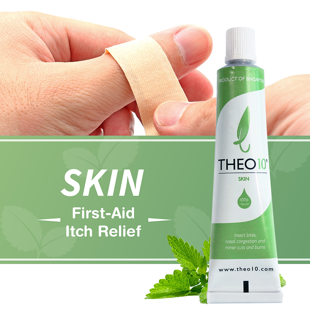 Theo10® SKIN is an all-natural non-steroidal first-aid cream that helps with insect bites, minor cuts and burns. A moisturizing first-aid cream that soothes open wounds, created using a range of all-natural ingredients including peppermint, neem oil, and beeswax.