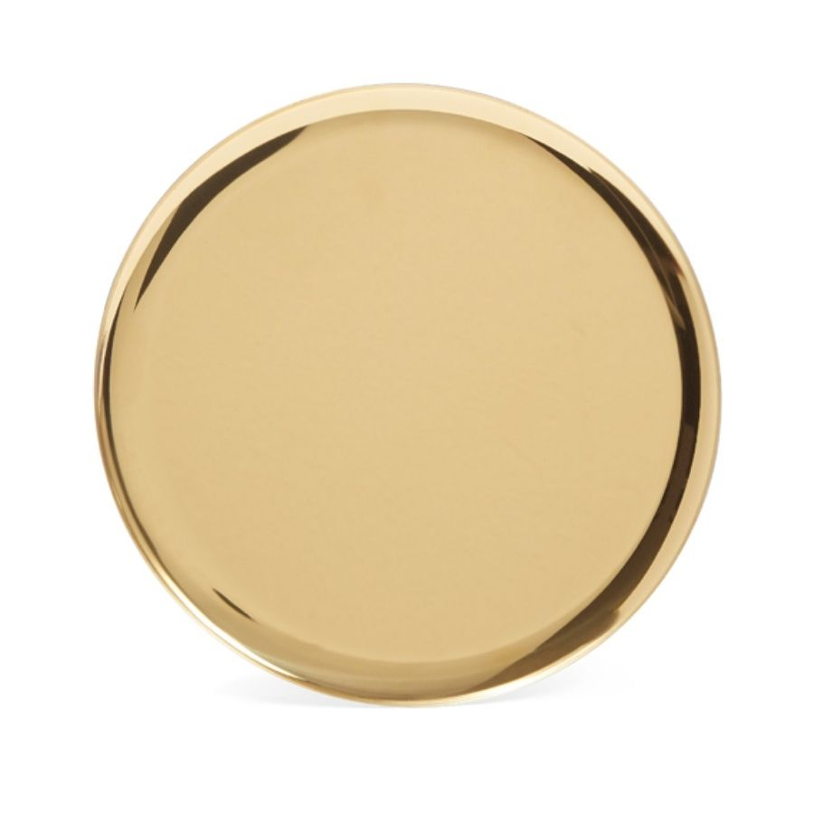 Gold-tone stainless steel circular serving piece featuring a polished finish, a metallic sheen, a round body and an upturned edge.