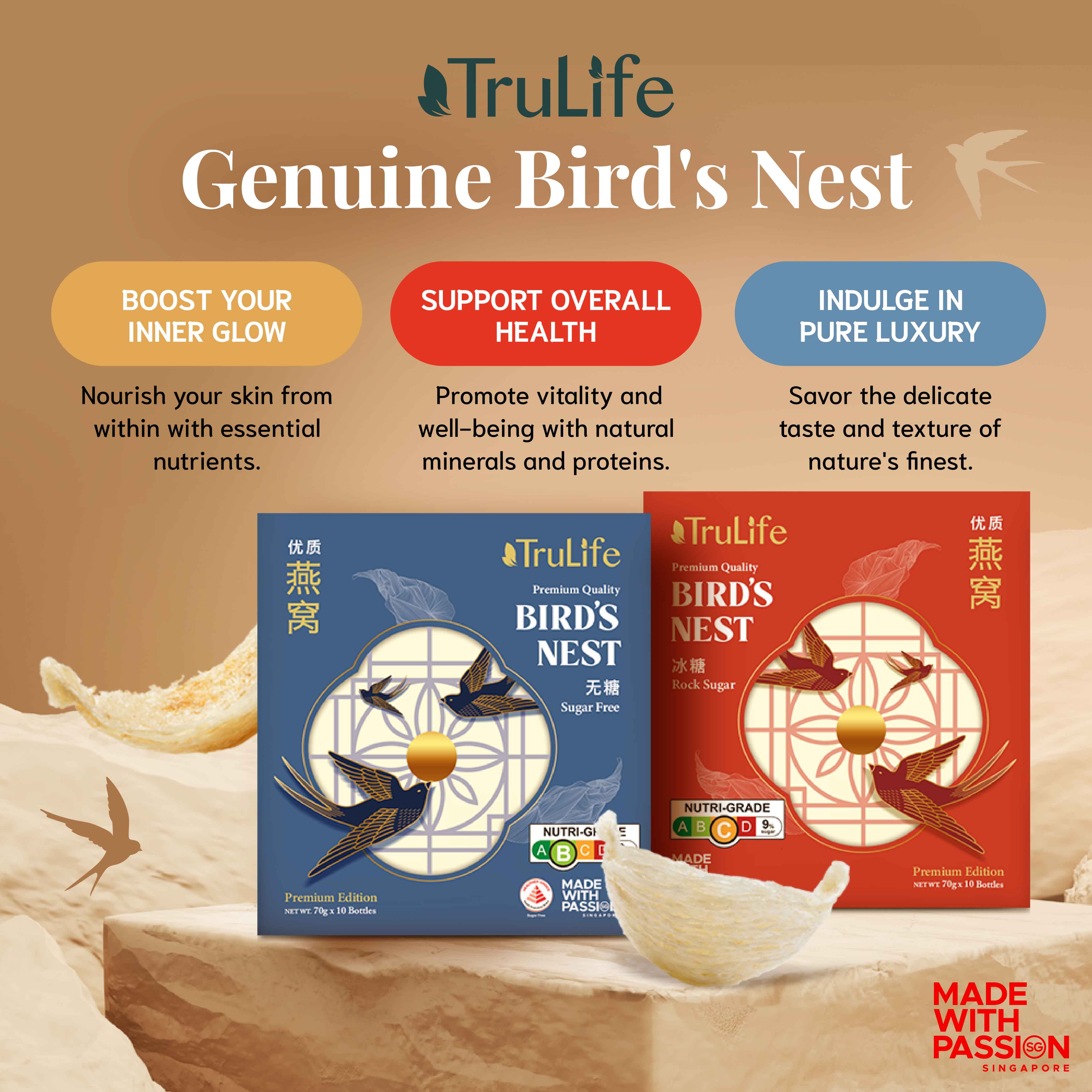 TruLife Premium Bird’s Nest with Rock Sugar Gift Pack is prepared with only the best grade of 100-percent authentic pure bird’s nest and rock sugar. It contains no artificial preservatives, flavouring or colouring, retaining the nourishing benefits and natural goodness of our traditional best-tasting recipe. High Content of Premium Quality Bird’s Nest 100% Pure & Genuine Bird’s Nest No Colouring, Preservatives, & Artificial Flavouring Great Taste & Texture.