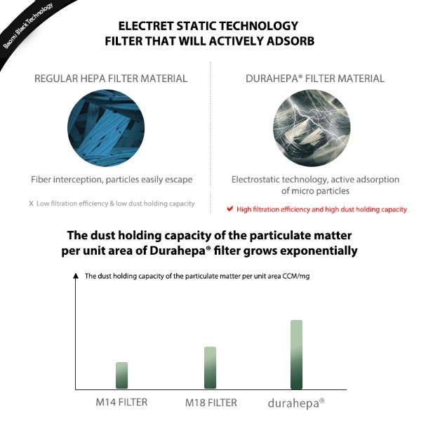 New filter Durahepa In the fibers of the durahepa filter, the finest electrodes are woven, which give the fibers a negative electric charge. With its help, the filter actively attracts and delays particles of pollution, which significantly increases the efficiency of air purification and filter resource.