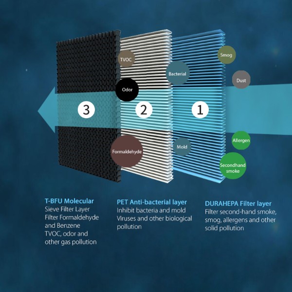 Multi-level filtering The Cleaner has a three-layer filtration system, which effectively copes with its tasks: The first layer is a pre-filter. Delays hair, dust and large particles; The second layer is durahepa. With high efficiency delays bacteria, viruses, aerosols and many other smallest pollutants; The third layer is the ultra-thin filter MHCC. Absorbs formaldehyde, benzene, organic compounds and more than 10 other types of hazardous gases