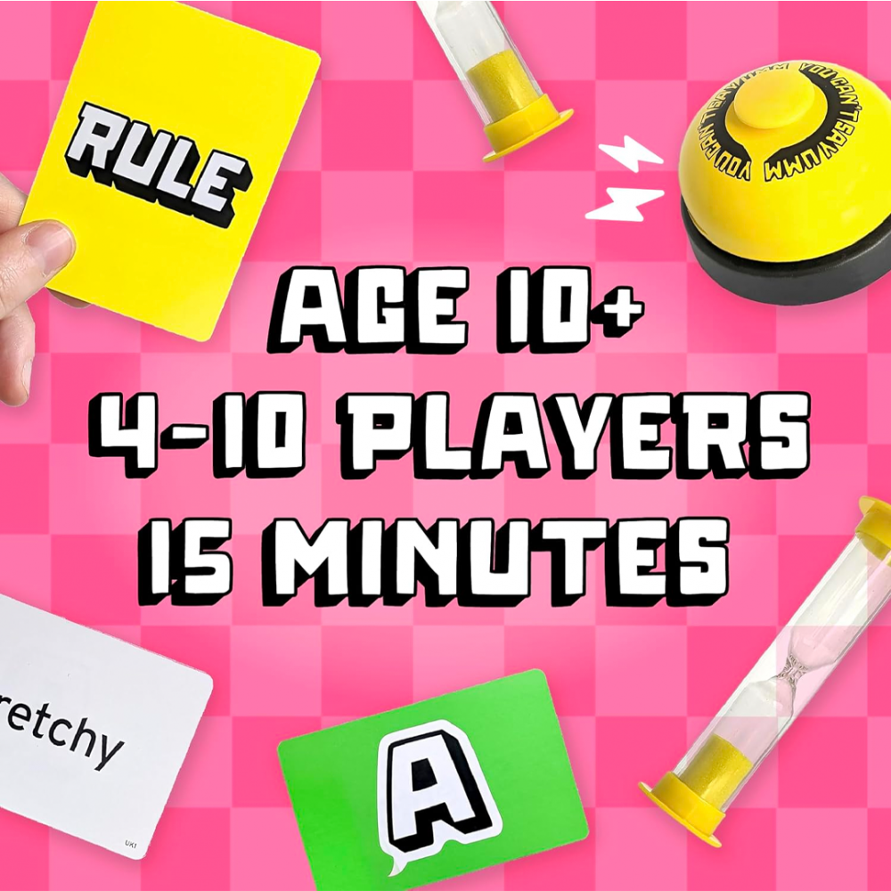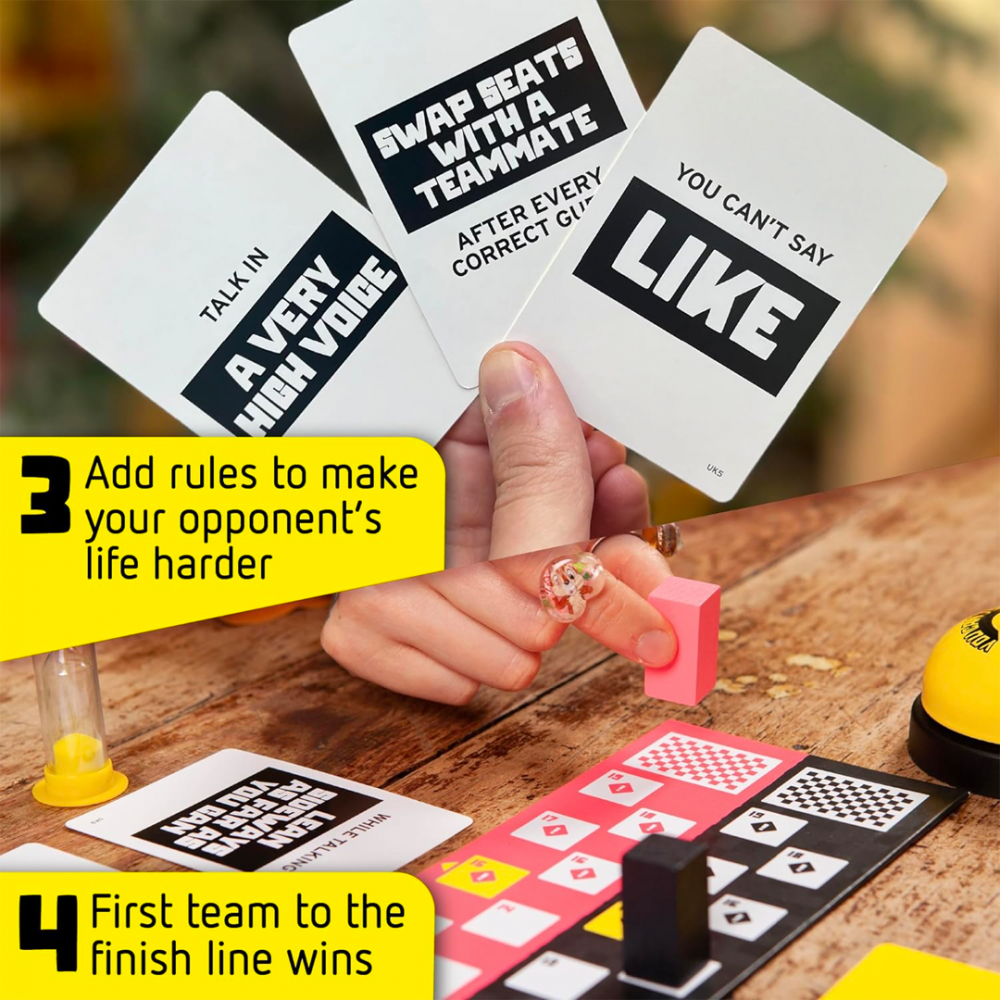 This is a noisy party game with one super, simple mission - you can't say "umm". Two teams race to get their pieces to the end of the board first. They'll do it by describing as many strange-sounding objects as they can, from the random cards they pick up. The only problem is: you can't say "umm". Every time you do, the bell will sound, adding to the pressure! As each team gets closer to the end, more and more sounds become off limit, making it a frantic dash to the finish line.