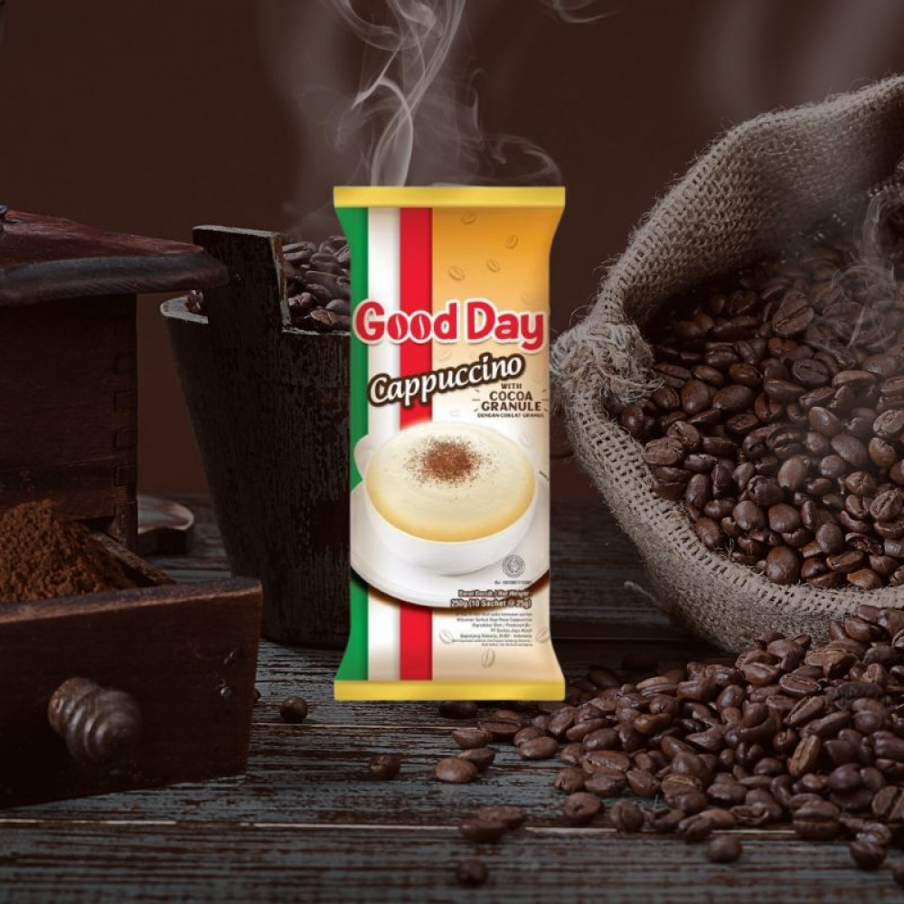 Good Day Cappuccino is an instant coffee beverage with coffee, sugar, and creamer all in one sachet. Enhanced with special chocolate granules, it's perfect for your moments of relaxation. The combination of coffee, creamer, and cappuccino creates a delicious cup of coffee, and the addition of tasty chocolate granules further elevates the coffee lover's experience.