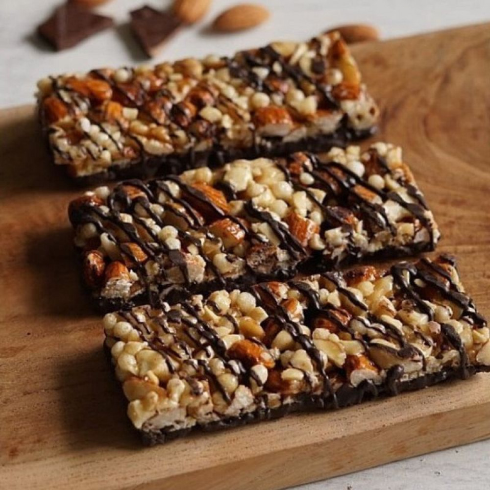 Composition = Dark Chocolate, Almonds, Peanuts, Honey, Rice Syrup, Rice Crispies, Cashews, Sea Salt (Seasalt)