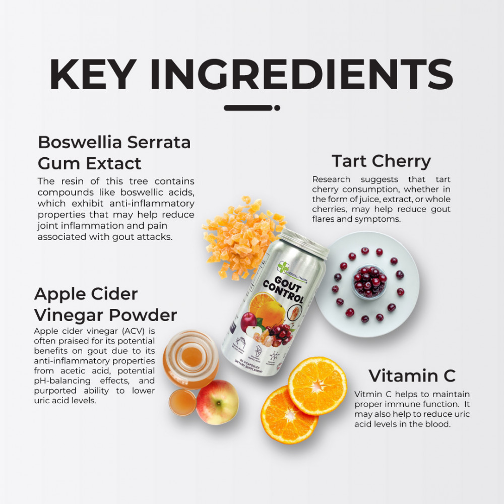 Herbal Pharm’s Gout Control is a targeted formula designed to help manage uric acid levels and ease gout-related joint discomfort. Powered by a blend of natural, plant-based ingredients like Tart Cherry, Apple Cider Vinegar, and Boswellia Serrata, it works to reduce inflammation and support joint flexibility—so you can move freely and live fully.