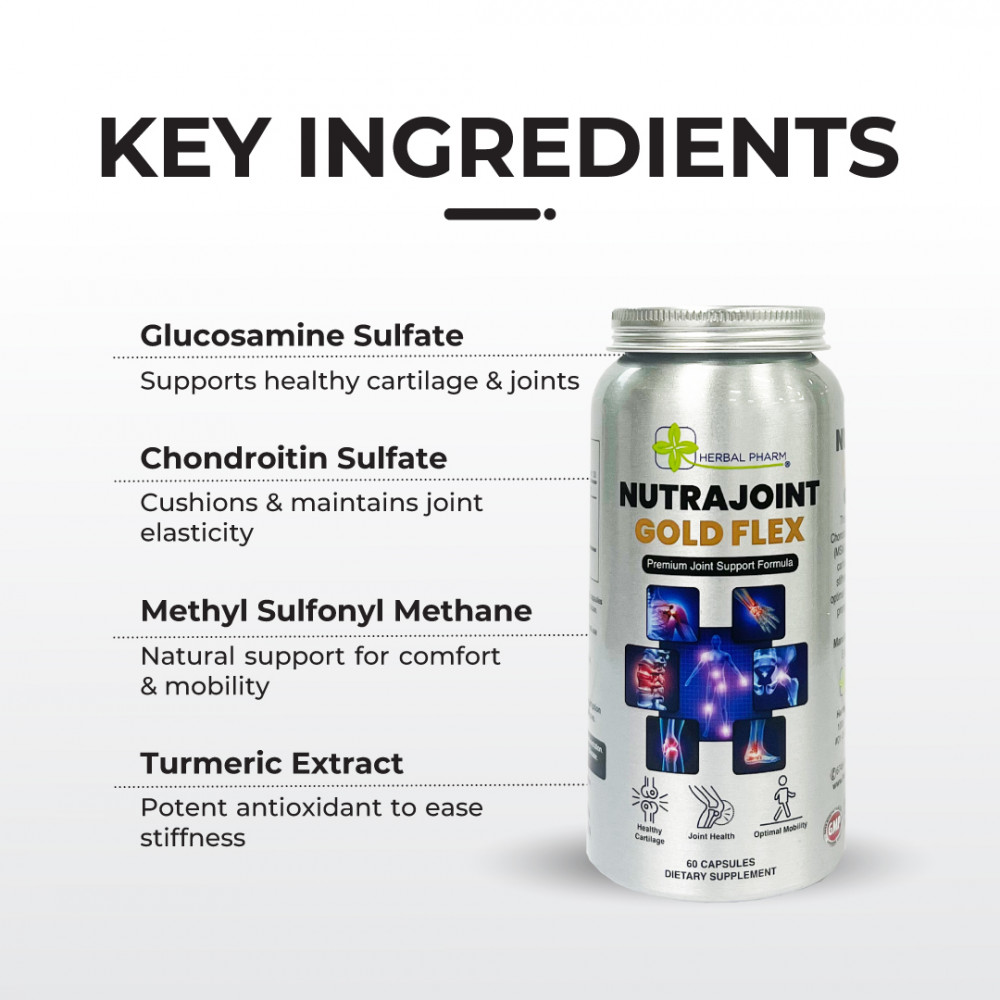 Herbal Pharm’s NutraJoint Gold Flex is expertly formulated to support joint flexibility, lubrication, and long-term comfort. With UC-II® Type II Collagen, Hyaluronic Acid, and Boswellia Serrata Extract, this premium joint supplement targets the root causes of joint discomfort—promoting healthy cartilage, mobility, and overall joint health for an active lifestyle.