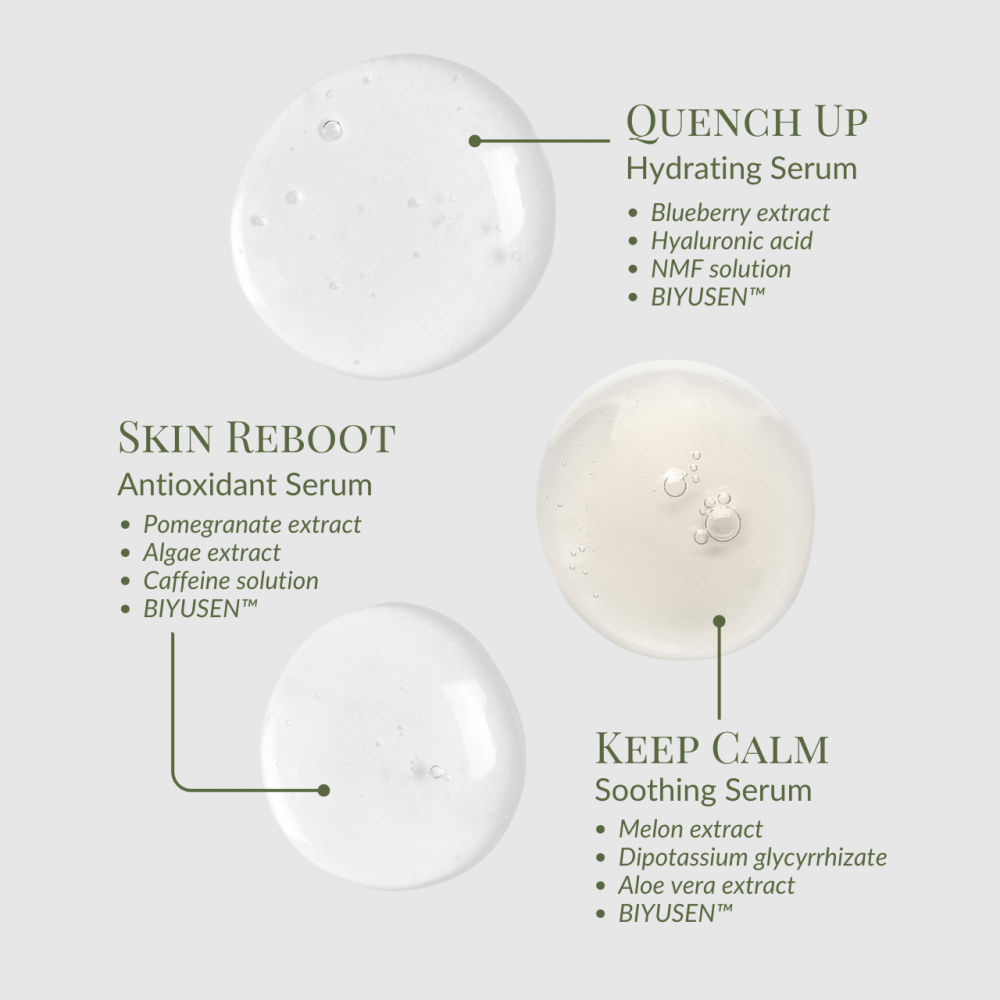 Envelop your skin in luxurious hydration and protection with these three-piece curated serum minis. Consisting of a blend of moisture-rich Biyusen™ and potent super fruits from Japan, this skin-healing trio works synergistically to replenish and refresh your dehydrated skin. It masterfully soothes skin and shields it from UV damage, free radicals, and environmental hazards for an instant and long-term plump, dewy, and refreshed complexion.