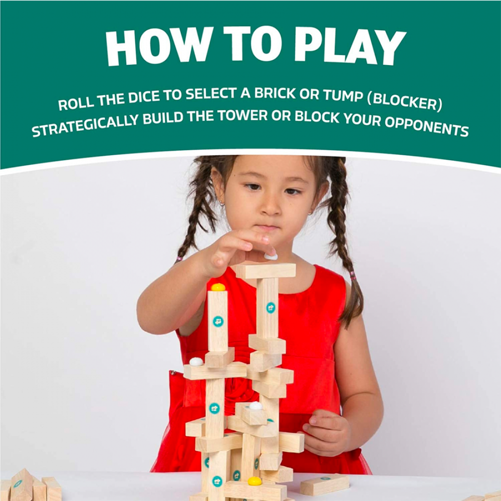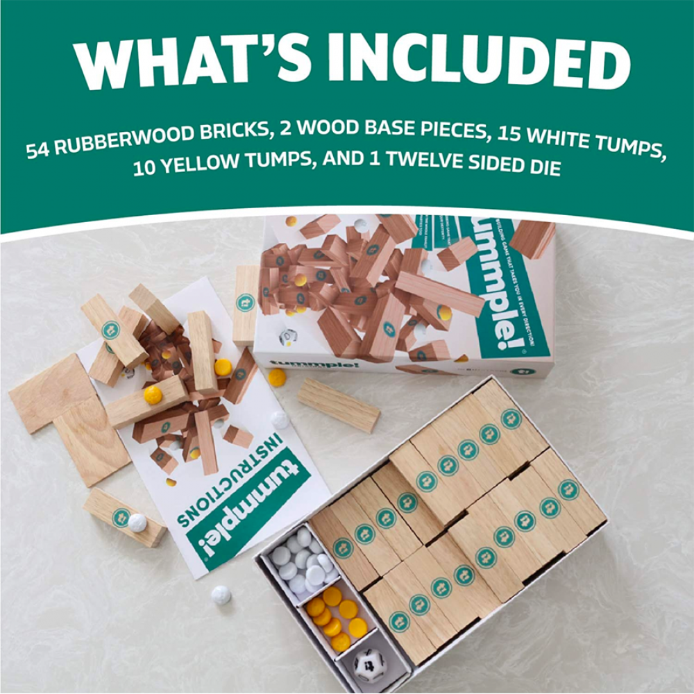 The building game that takes you in every direction tummple! It's a blast for the whole family, and great at parties too. Strategically place wood bricks and obstacles, called 'tumps'... watching the structure form... up, down, sideways and every way. Build it, name it, love it, memorialize it!