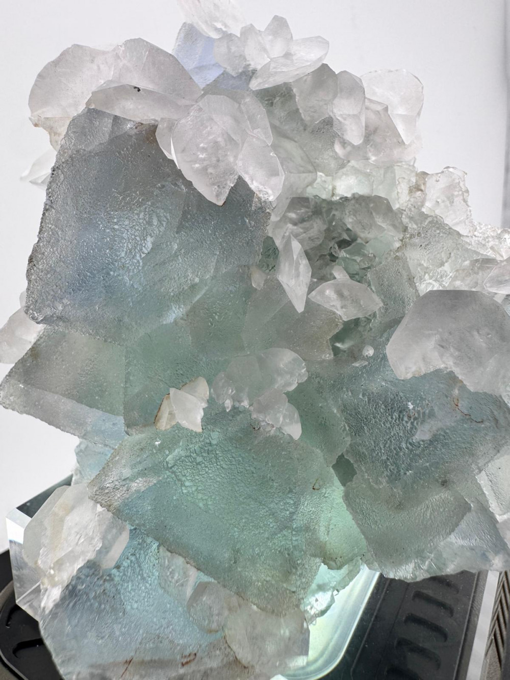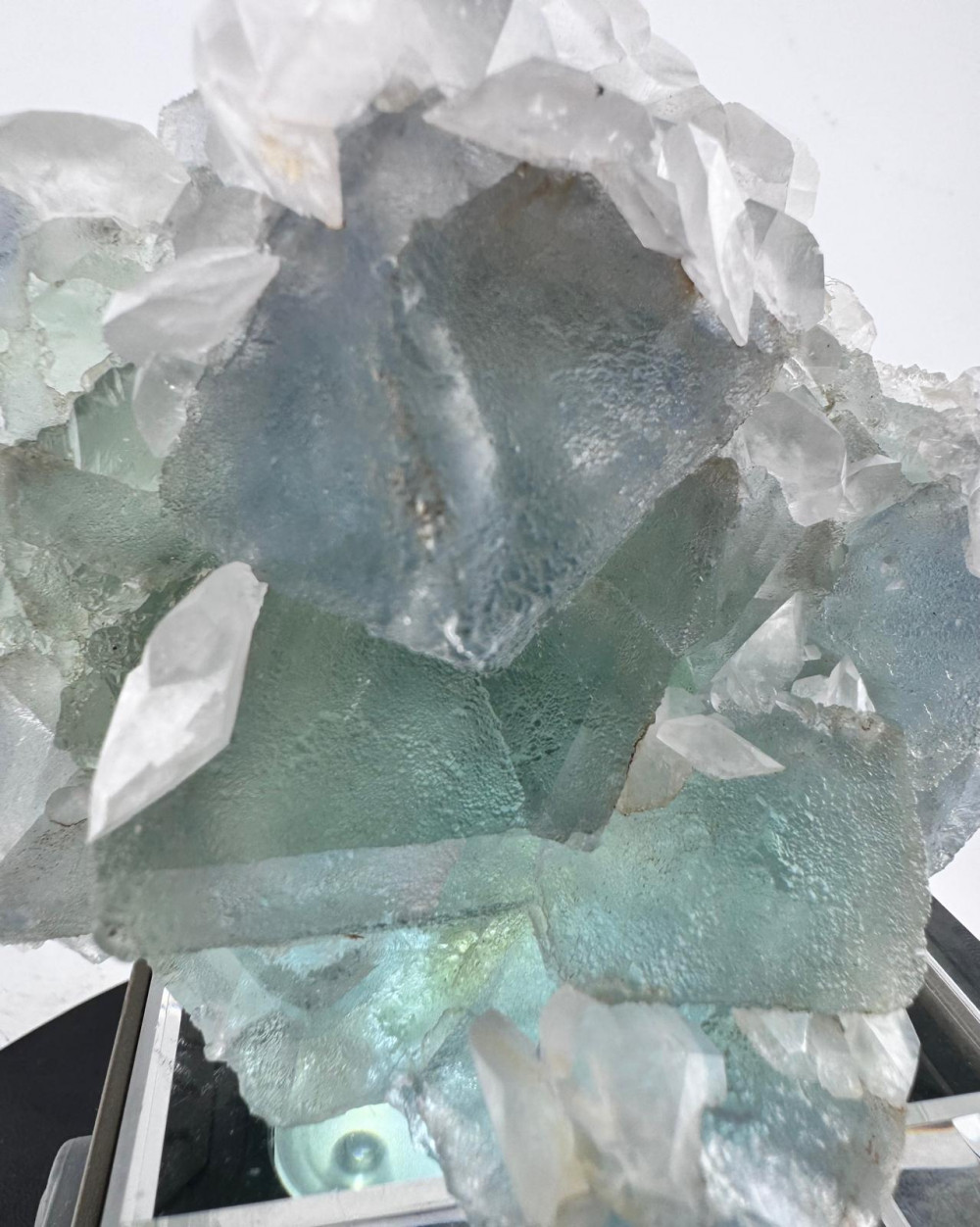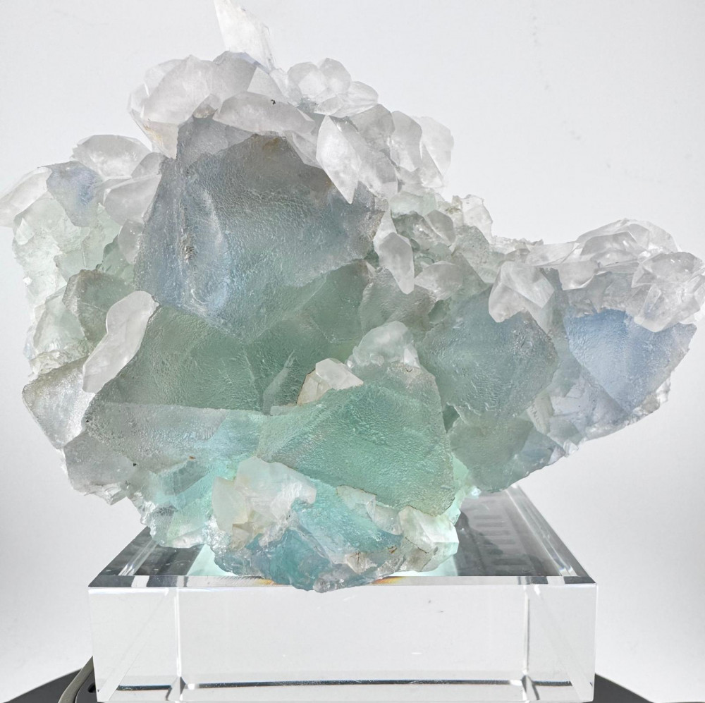 Elevate your crystal collection with this stunning group of vivid green fluorite crystals with blue undertones. The specimen showcases perfect octahedral formations with mesmerizing microcrystalline surfaces and an intense pearly luster that’s iconic to this mine’s finest specimens. Admire the flawless three-dimensional structure and translucent color that radiates natural beauty from every angle. What sets this piece apart is the sharp and transparent lenticular calcite crystals partially coating the fluorite, creating a captivating crystal duet.